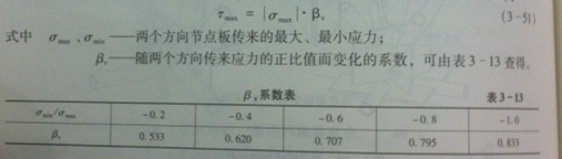 在設(shè)計(jì)坡口焊的十字節(jié)點(diǎn)板的中間豎向焊縫時,應(yīng)根據(jù)兩個方向節(jié)點(diǎn)板傳來的應(yīng)力符號是否相同而區(qū)別對待。兩個方向應(yīng)力富奧相同時,可近似地按節(jié)點(diǎn)板傳來的最大應(yīng)力進(jìn)行焊縫強(qiáng)度驗(yàn)算,驗(yàn)算時可采用對按焊縫、抗壓強(qiáng)度設(shè)計(jì)值。當(dāng)兩個方向節(jié)點(diǎn)板傳來的應(yīng)力符號不同時,除按上述方法進(jìn)行抗拉、抗壓強(qiáng)度驗(yàn)算外,尚應(yīng)驗(yàn)算其抗剪強(qiáng)度,剪應(yīng)力值可近似地按兩個方向節(jié)點(diǎn)板傳來的絕對值最大的應(yīng)力乘以系數(shù)p,求得下列公式,即: